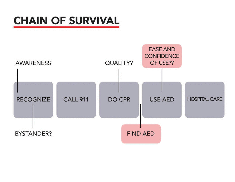 The chain of survival, the life-saving actions to take during cardiac arrest, revealed several opportunities to incorporate the Automatic External Defibrillator into the chain of survival at an earlier stage. I focused on the stage of finding the AED as well as the ease and confidence of use.