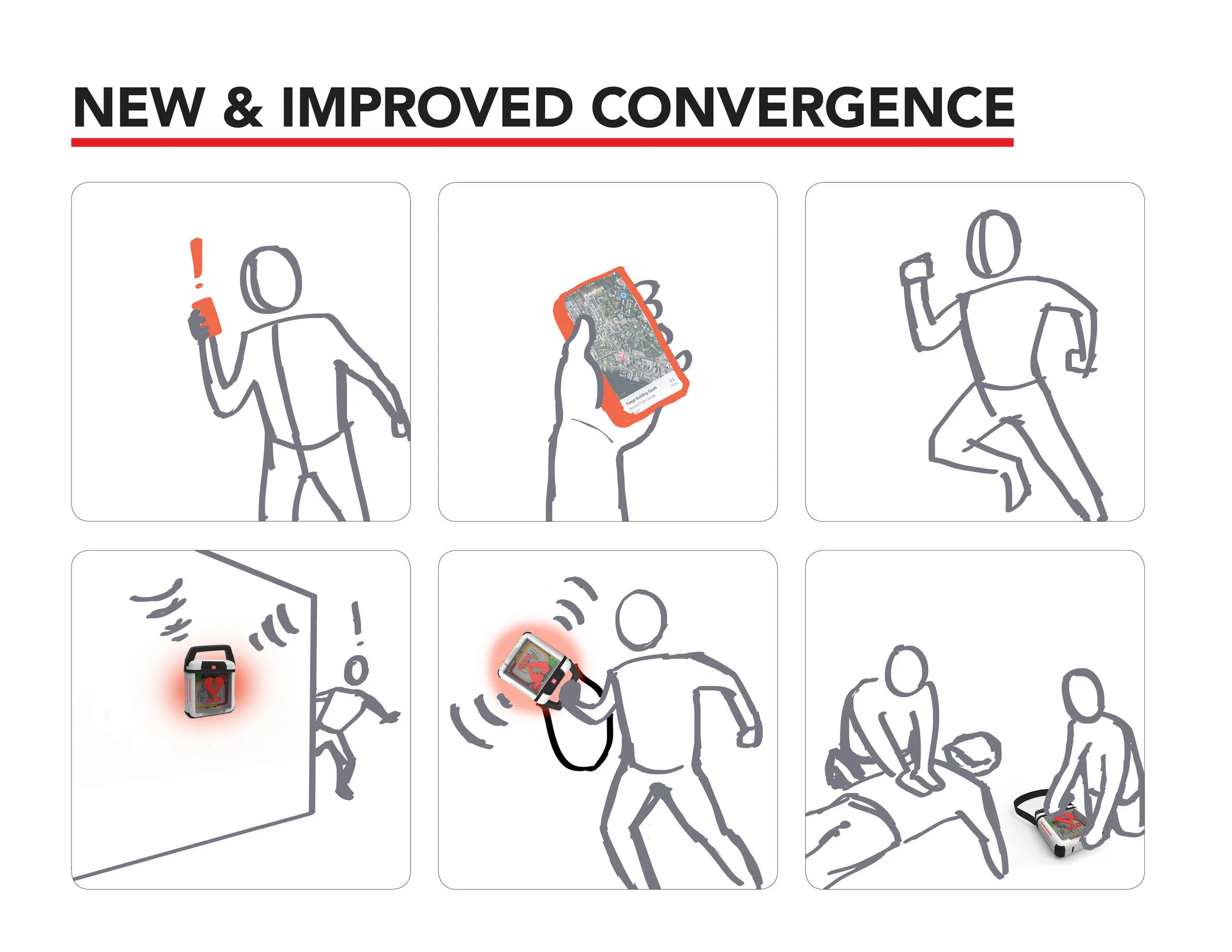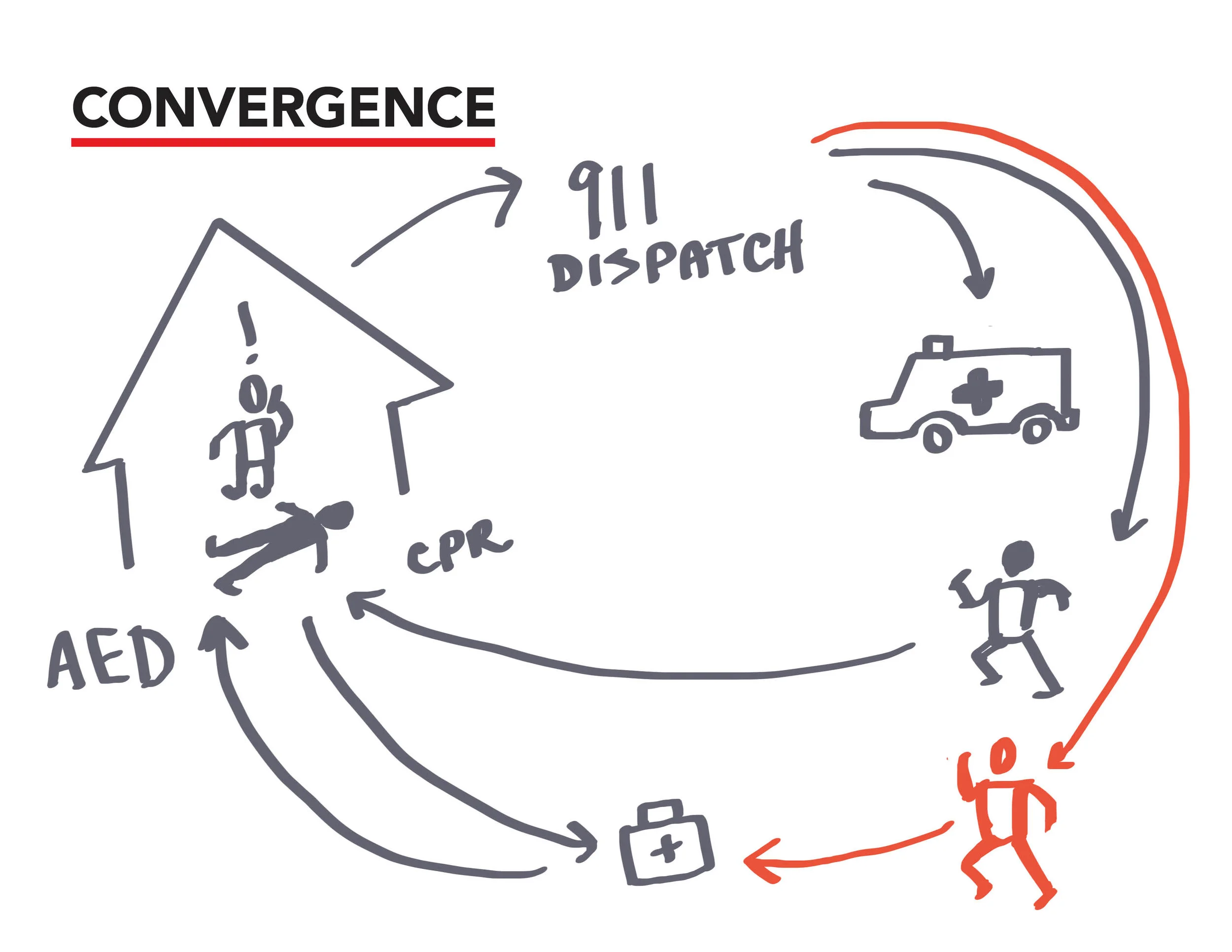 The CPR administer, the AED, and the ambulance all independently converge on the sudden cardiac arrest victim for the fastest treatment.