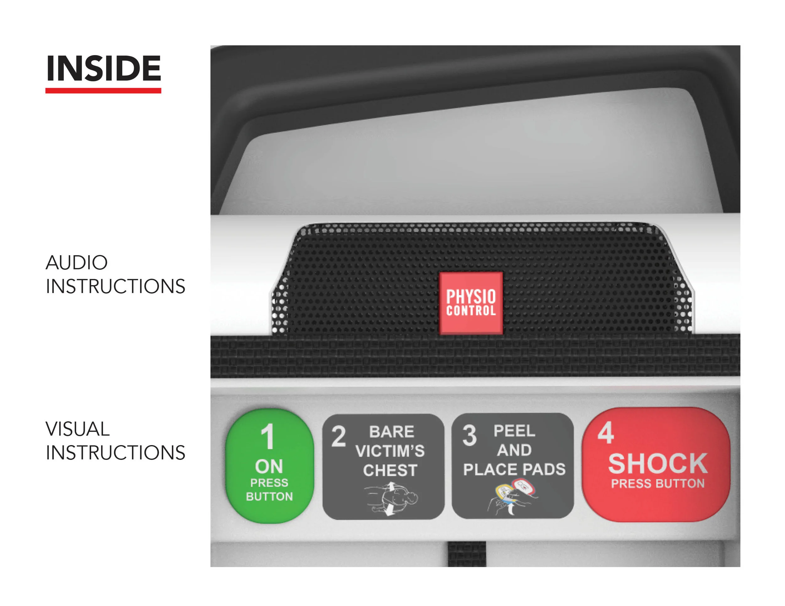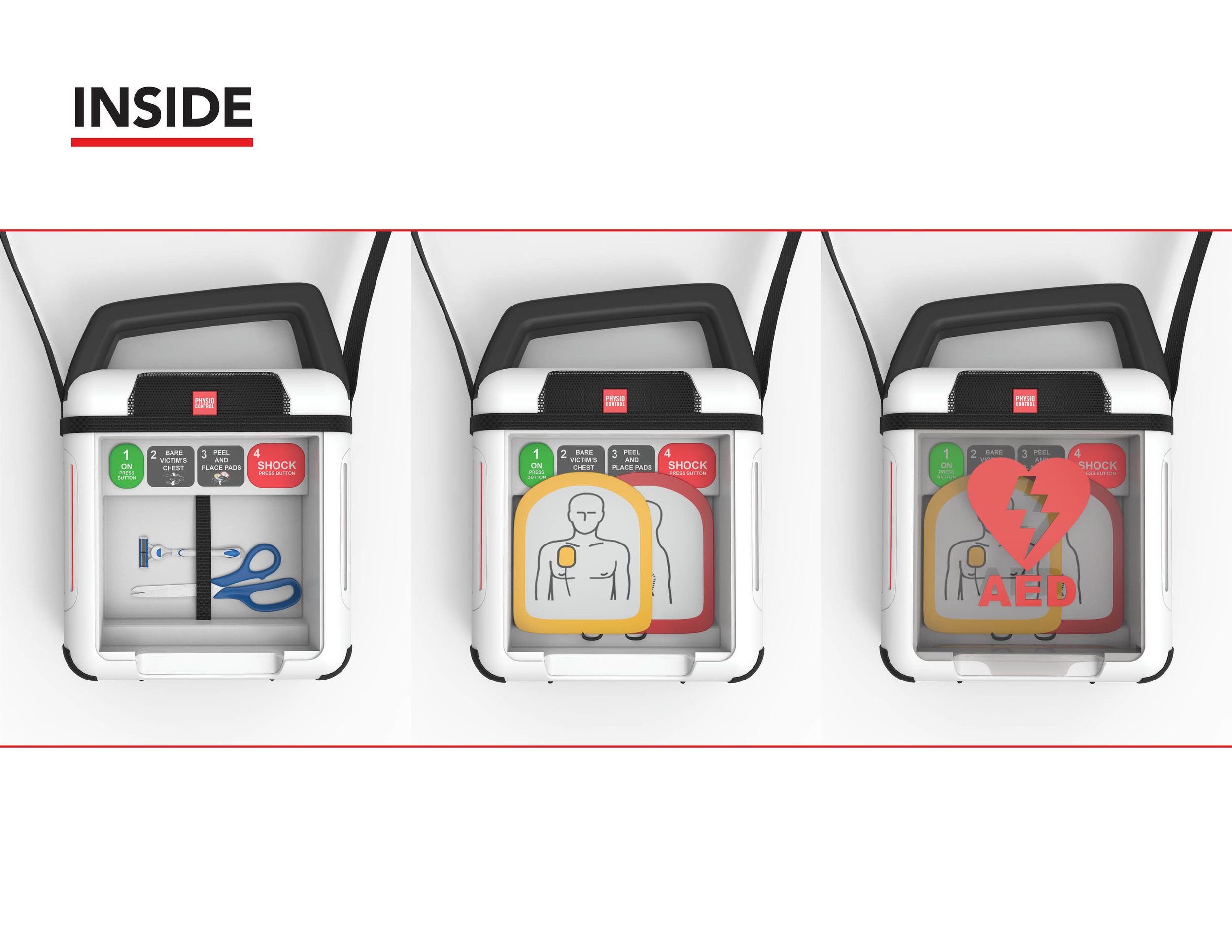 The AED stores accessories (for scissors and a razor for removing hair, extra pads, etc.) and standard Physio-Control pads. It features a hard plastic case (transparent to familiarize potential users with the contents of the AED before an emergency situation even occurs).