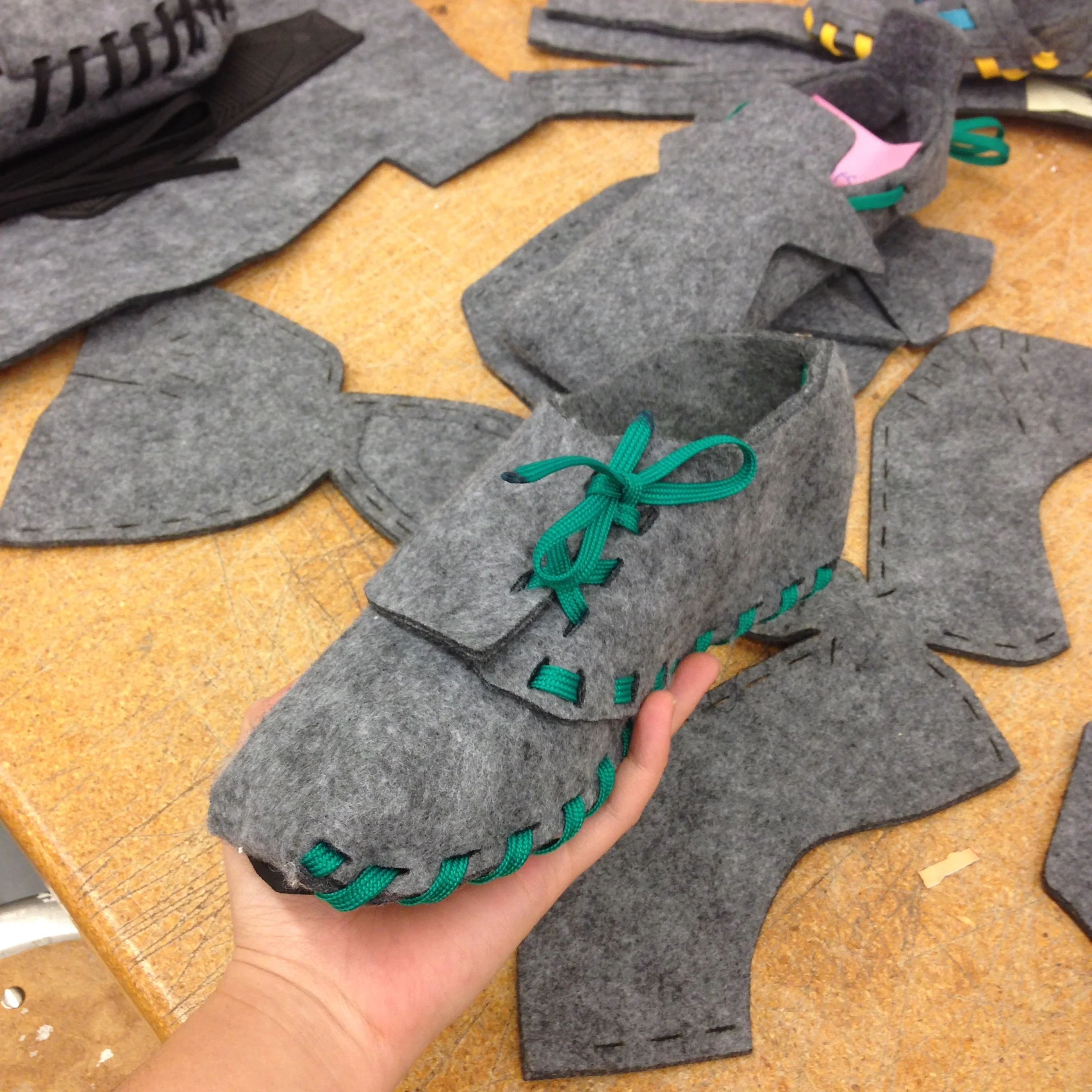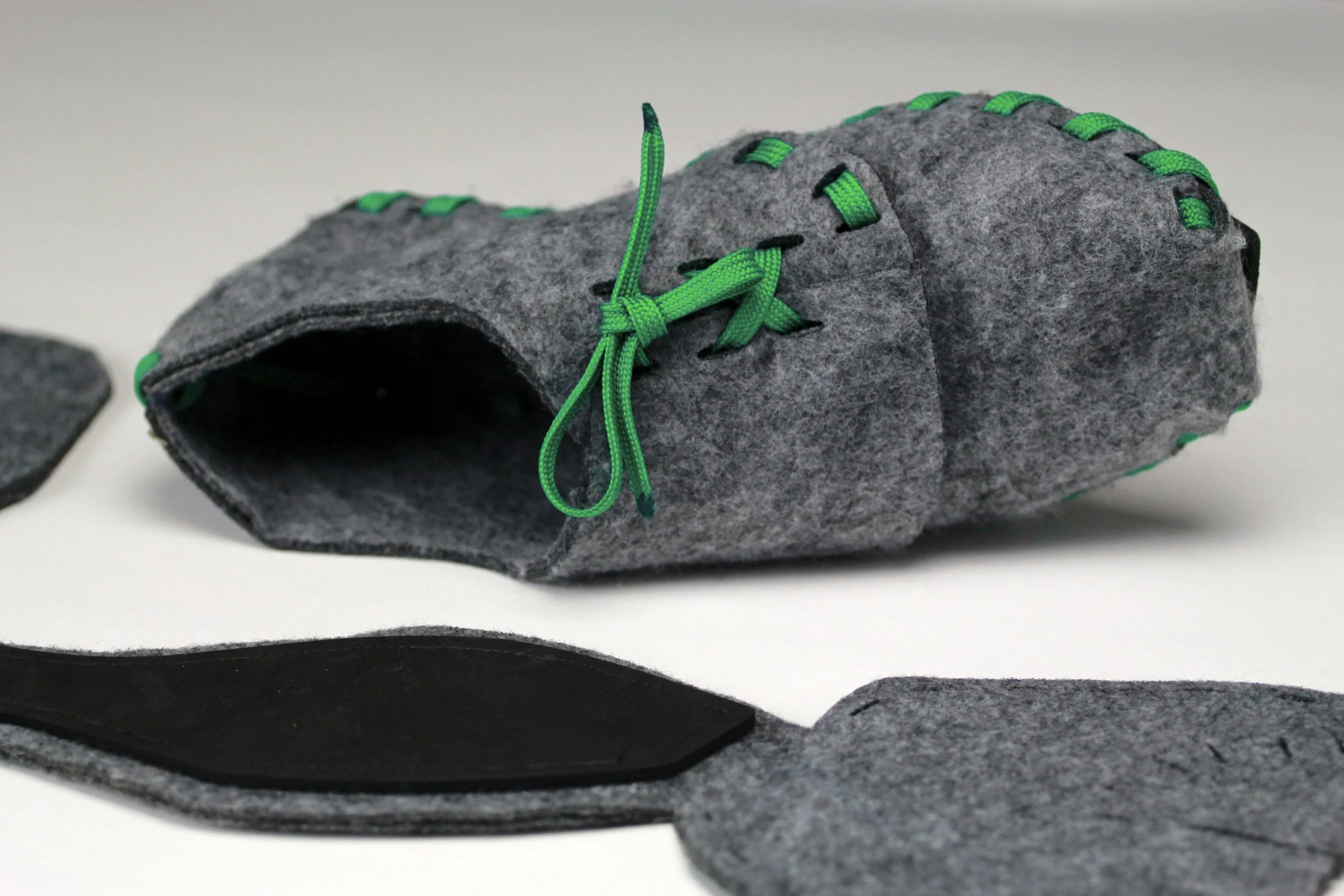 Make a pair of flatpack felt shoes that assemble with a single lace and whose 'footprint' fits on a single laser cutter bed.